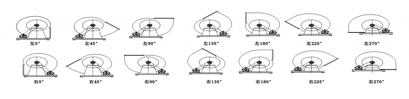從電機一端正視,葉輪順時針旋轉(zhuǎn)的稱為右旋風機,以“右”表示,反之為左旋風機,以“左”表示。風機的出風口位置,以機殼的出風口角度表示。